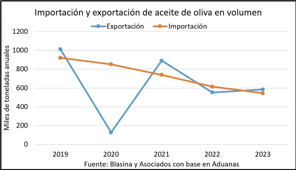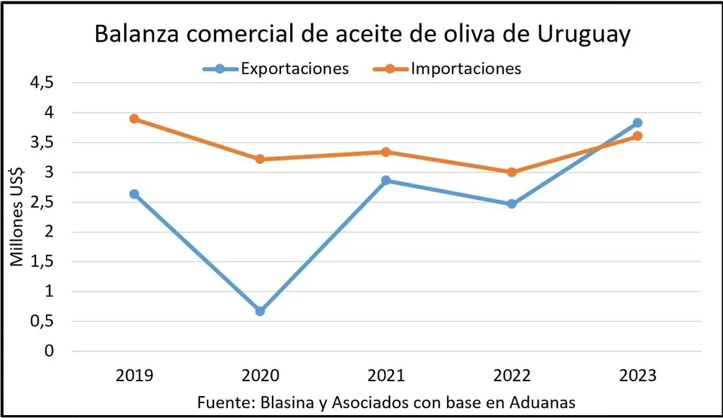 Las estadísticas comerciales dan sostén a la cifra: entre 2019 y 2023 el ingreso de aceites de oliva importados cayó más de 40% y en 2022 se importaron 615 toneladas, al tiempo que se volcaron al mercado interno unas 844 toneladas de aceites uruguayos.