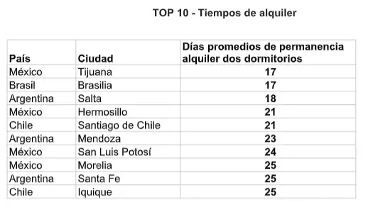 Argentina mostró los tiempos más rápidos de alquiler con una media de 27,7 días, seguido por Chile con 29,8 días, México con 33 días, Brasil 33,1 días y, cerrando la lista, Uruguay con 45,3 días.