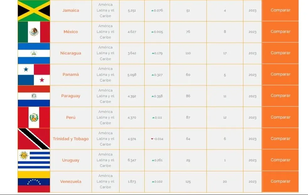 Tomando en cuenta esas variables los resultados 2023 demostraron que luego de Uruguay, el país de la región con mejor índice es Chile, que se ubicó en el puesto 38. Ese país se había ubicado en primer lugar a nivel latinoamericano en 2022.