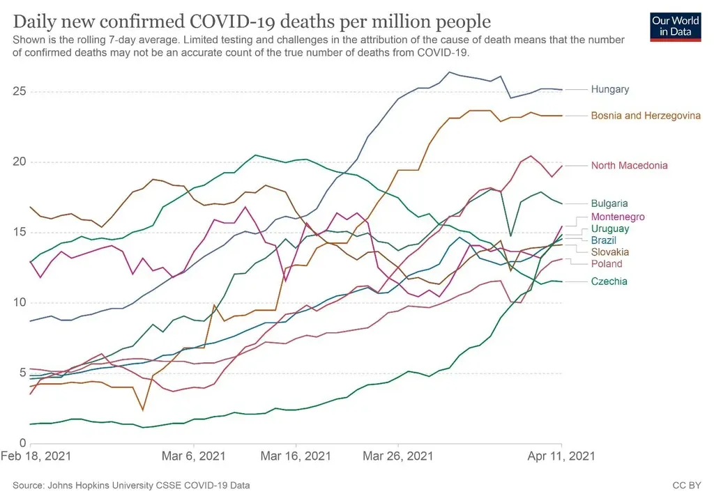 Seis días atrás Uruguay era el décimo país con más muertes por millón de habitantes en el promedio semanal a causa de covid-19. Este lunes escaló al puesto 6°, superando en ese lapso a República Checa, Polonia, Eslovaquia y Brasil. El país presenta una pendiente ininterrumpida en la mortalidad desde el comienzo de marzo.
