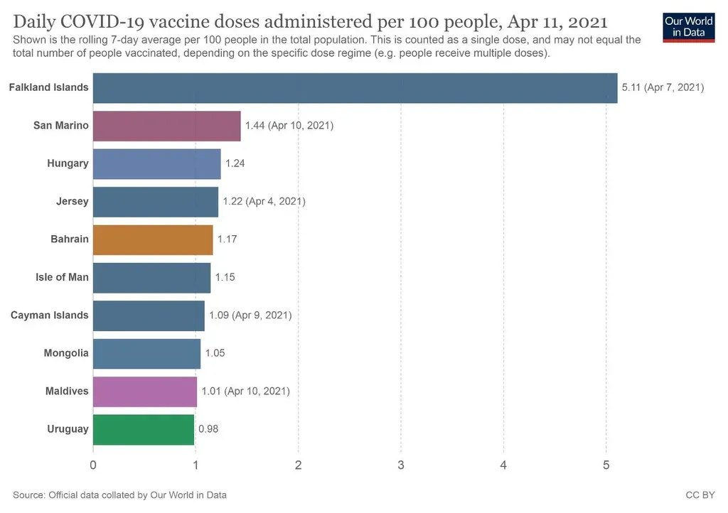 No obstante, del ranking de países con valores más elevados de mortalidad a causa de la enfermedad, Uruguay es el segundo que viene a mejor ritmo en la vacunación, después de Hungría. El país logra inocular prácticamente a un uruguayo por cada 100 si se considera el promedio semanal. Eso lo sitúa en el puesto 10 del ranking mundial, en una escala liderada con amplia ventaja por las Islas Malvinas, donde viven unas 3.000 personas.