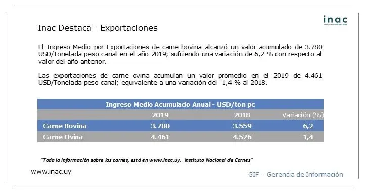 En carnes vacunas se exportaron, considerando el peso canal, 374.651 toneladas (1,5% más que en 2018) a cambio de US$ 1.416 millones, lo que da un promedio por tonelada de US$ 3.779,5 para lo que va de 2019 (superior 6,2% al valor promedio del mismo período de 2018).