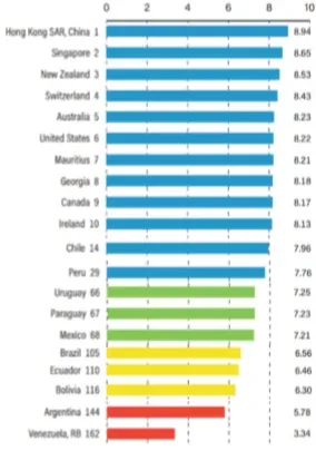 En cuanto al marco legal y derechos de propiedad el país tiene una buena posición relativa. También aparece bien posicionado en el tema libertad para comerciar. No obstante, el subíndice regulaciones en una posición sustancialmente elevada, lugar 90. En este tema vuelve a surgir con fuerza los problemas de regulación en el mercado de trabajo. En el marco de muchos países que vienen avanzando con decisión hacia mayores niveles de libertad económica, el estancamiento de Uruguay "puede hacer retroceder significativamente en estos indicadores", dice el informe.