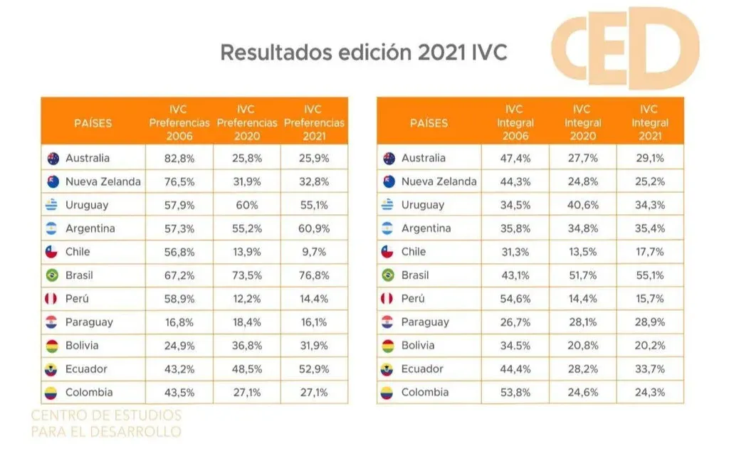 Este martes, el CED divulgó un informe con los resultados del IVC con la particularidad de que lo hizo a escala sudamericana, con el apoyo de seis think tanks de Argentina, Chile, Brasil, Perú y Uruguay, y la Atlas Network de los Estados Unidos.