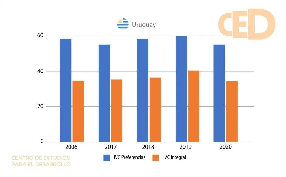 Uruguay mostró un IVC-P de 55,1% frente al 60% del 2020. Según el CED, esta disminución “no responde a una mejora de la inserción comercial” sino que se debe a “pequeños cambios en los pesos relativos de los principales destinos de exportación”.