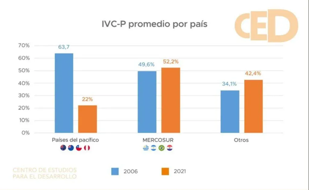 Desde el CED se destacó a los países del pacífico, un grupo compuesto por Australia, Chile, Colombia, Nueva Zelanda y Perú, como los que tienen una “inserción comercial virtuosa”. En el 2006 el IVC-P promedio para este grupo era de 63,7% y 2021 se redujo a 22%, algo que se explica por una “enorme carrera de firma de acuerdos comerciales por parte de los países”.