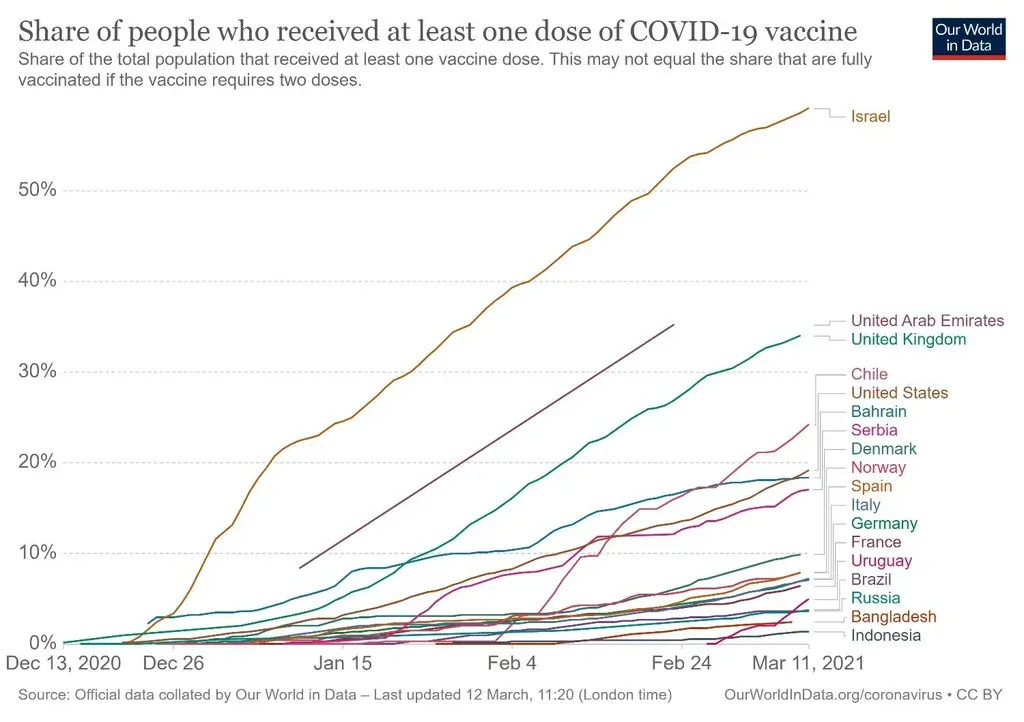 Israel es el país que lidera el ranking mundial de vacunación, en cuanto al porcentaje que ha recibido la primeras dosis, seguido del Reino Unido, Chile, Estados Unidos y Bahrein. Uruguay ya se ubica entre las primeras 15 naciones del mundo (está en el lugar 13).