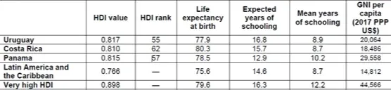 Para el grupo de América Latina y el Caribe, se compara a Uruguay con Costa Rica y Panamá, que tienen índices de desarrollo humano que resultaron en los puestos 62 y 57, respectivamente.