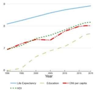 Entre 1990 y 2018, el valor del IDH de Uruguay aumentó de 0,694 a 0,817; esto es una mejora de casi el 18%. Entre 1990 y 2019 la esperanza de vida al nacer de Uruguay aumentó en 5,3 años, el promedio de años de escolaridad aumentó en 1,8 años y los años esperados de escolarización aumentaron en 4 años. Asimismo, el Ingreso Nacional Bruto per cápita (IBN) de este país aumentó en 104 % entre 1990 y 2019, dice el informe.