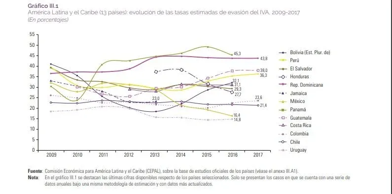 De entre 12 países seleccionados en América Latina y el Caribe, el que más evasión presenta sobre este impuesto en particular es Panamá, con un valor del 45,3%, según un informe realizado por la Comisión Económica para América Latina y el Caribe (Cepal) sobre el panorama fiscal de la región.