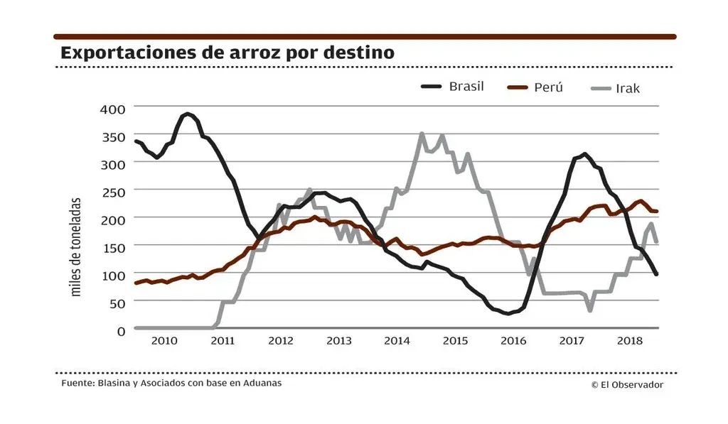Uruguay exporta casi la totalidad del arroz que produce. No tiene mayores dificultades en lo productivo y por ello y por la calidad del grano está entre los líderes en el mercado internacional. Además, suele concretar los negocios en forma fluida y a precios considerados buenos. El obstáculo, sostienen los productores, es interno, concretamente los costos para producir en las chacras y también los costos industriales.
