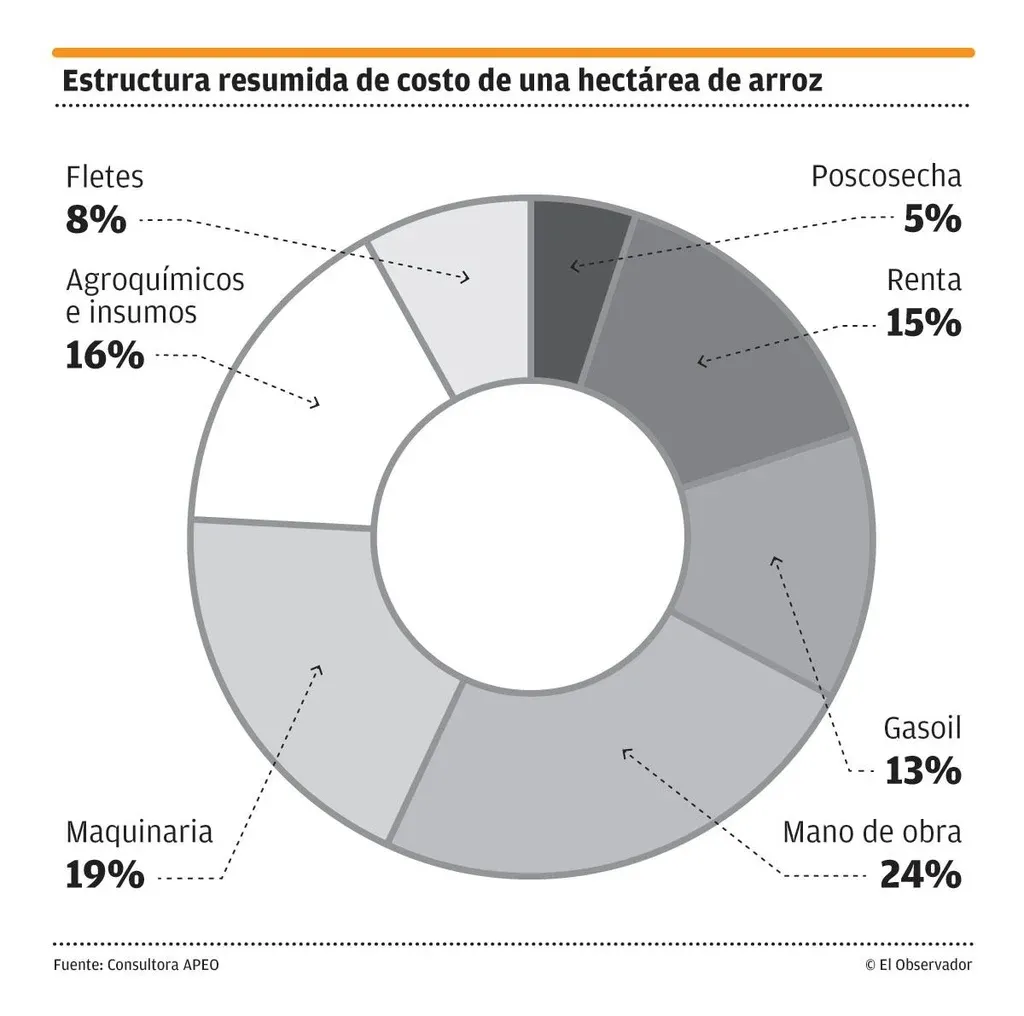 En un estudio realizado por la consultora Apeo Agro –asumiendo que cada empresa tiene su estructura de costos propia–, se cálculo que la “estructura resumida de costo de una hectárea de arroz” se divide: 8% en fletes, 5% en poscosecha, 15% de la renta, 13% el gasto de gasoil, 24% la mano de obra, 19% en maquinaria y 16% en costos por agroquímicos.