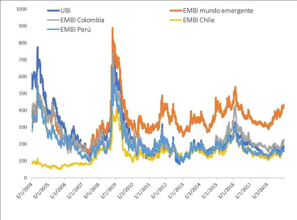 Gráfico 1 - UBI y EMBIS de Colombia, Chile, Perú y el mundo emergente.