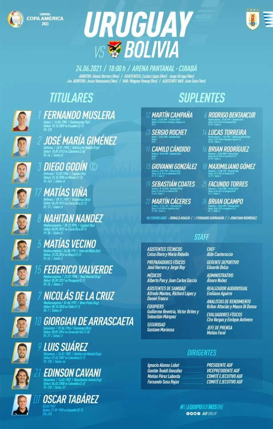 Uruguay: Fernando Muslera; Nahitan Nández, José María Giménez, Diego Godín, Matías Viña; Federico Valverde, Matías Vecino, Nicolás De la Cruz; Giorgian De Arrascaeta; Luis Suárez y Edinson Cavani. DT: Óscar W. Tabárez. Suplentes: Martín Campaña, Sergio Rochet, Camilo Cándido, Giovanni González, Sebastián Coates, Martín Cáceres, Rodrigo Bentancur, Lucas Torreira, Brian Rodríguez, Maximiliano Gómez, Facundo Torres y Brian Ocampo. Quedaron fuera del plantel Ronald Araújo, Fernando Gorriarán y Jonathan Rodríguez.