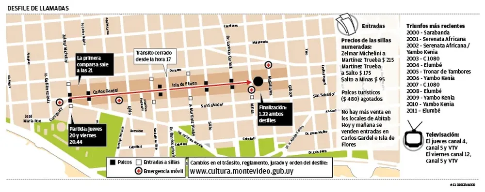 Un premio de $ 100.200 recibirá la comparsa ganadora del Desfile de Llamadas, que se desarrollará hoy y mañana, en dos noches como fue habitual en los últimos años, con 40 conjuntos en el concurso y otros dos invitados que exhibirán sus propuestas por las calles Carlos Gardel e Isla Flores desde Zelmar Michelini hasta Minas.