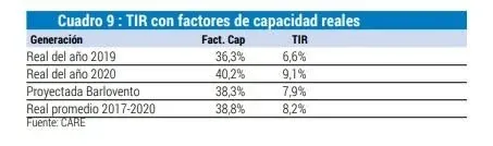 La calificadora de riesgo Care recalculó la Tasa Interna de Retorno (TIR) sobre la base del modelo financiero original, ajustando la producción a la real lograda hasta el momento. Según la agencia, si bien el factor de capacidad es inferior al esperado, está muy por encima de los valores críticos. Eso aseguraría una TIR del 8,2% anual en dólares.