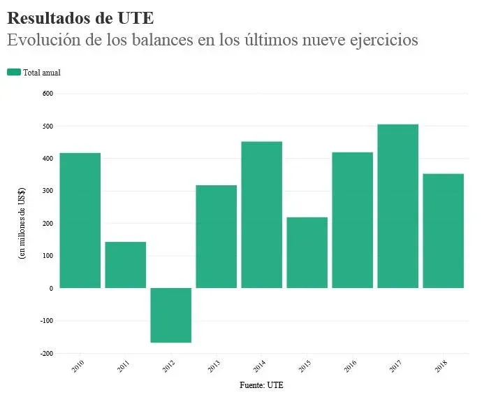 La empresa estatal UTE ganó US$ 352 millones en 2018 y así completó seis años consecutivos con números positivos. El resultado estuvo algo por debajo que el obtenido en 2017. Los números muestran que las ganancias fueron por $ 11.404 millones en términos corrientes. En el ejercicio previo, los beneficios habían ascendido a $ 14.436 millones (US$ 504 millones). Al comparar los dos últimos años la ganancia medida en pesos fue 20 % inferior.