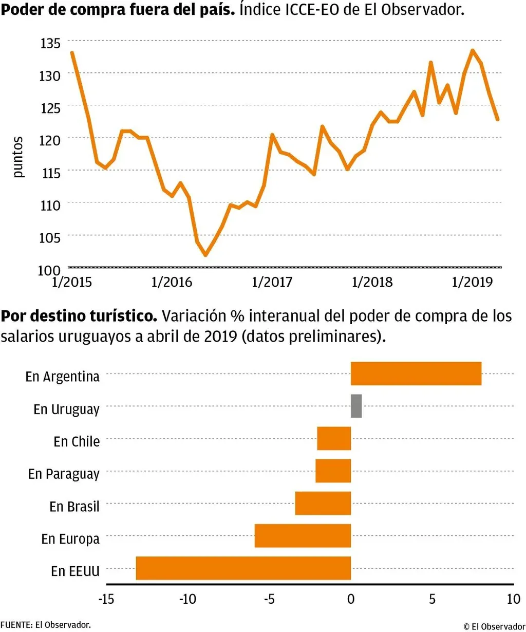 Eso lleva a que los uruguayos se vean afectados por un peso argentino que pierde valor y si bien los salarios en Uruguay suben, no alcanzan a compensar esa pérdida. En los primeros cuatro meses del año, la pérdida de poder de compra de los turistas locales en Argentina fue de 9% mientras que en el mercado local ganaron 1,4% debido a un aumento de los salarios por encima de la inflación.