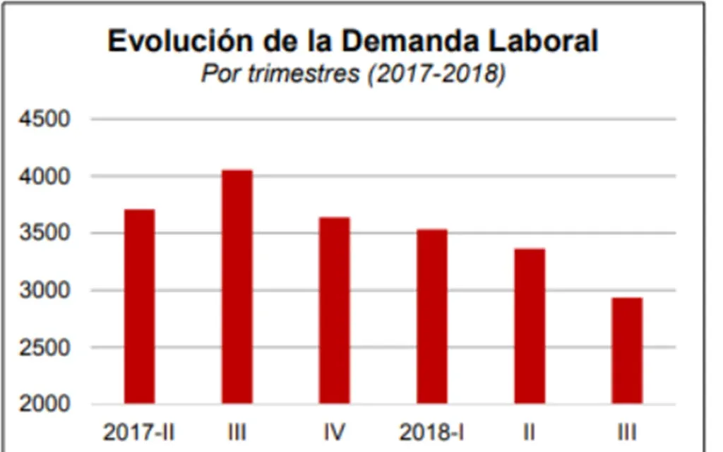 En años anteriores ya se habían producido caídas mayores (en los primeros trimestres de 2016, por ejemplo, la brecha interanual superó el 30%), pero como la contracción de la demanda laboral ha sido continua durante los últimos años, esto determina que el volumen actual de 2.900 vacantes fue el registro más bajo para un trimestre desde 2012, destaca la publicación.