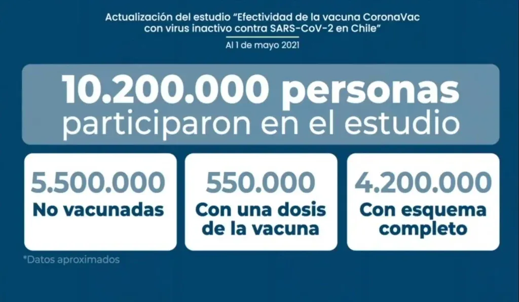 Esta investigación tomó el período que va del 2 de febrero al 1° de mayo y abarcó el análisis de 10,2 millones de personas, de las cuales 4,2 millones ya habían culminado el proceso de vacunación. Es la ampliación de un estudio presentado en abril y que iba del 2 de febrero al 1° de abril. Esa primera versión mostraba un 67% de efectividad para prevenir el covid sintomático, 85% respecto a hospitalizaciones, 87% para CTI y 80% para muertes.