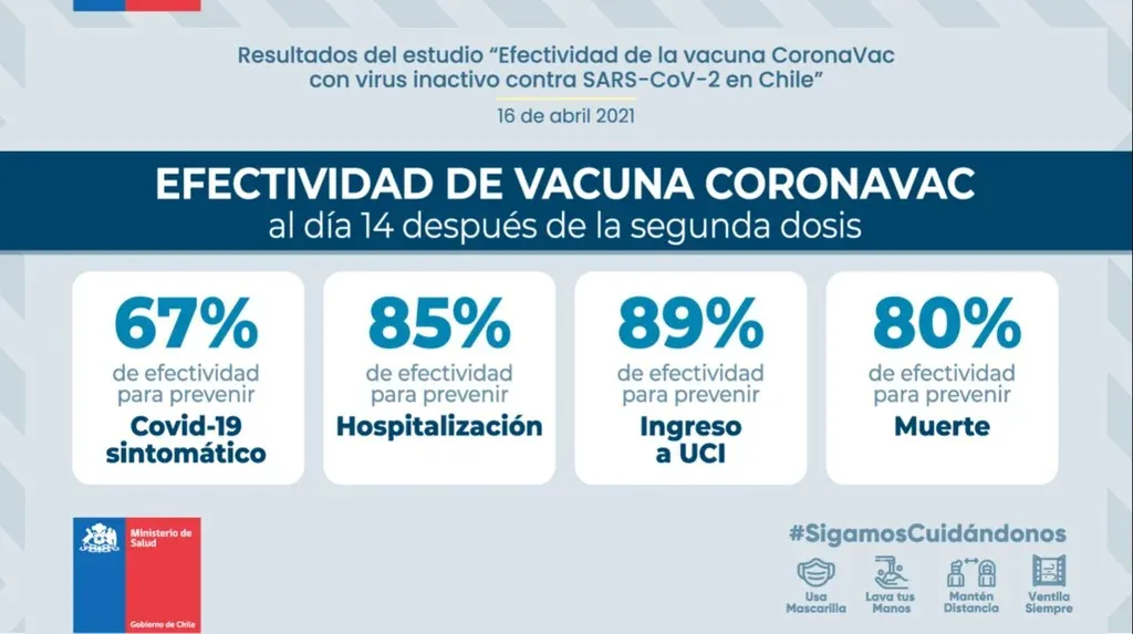 El Ministerio de Salud de Chile publicó el viernes un estudio sobre la eficacia de la Coronavac, la vacuna contra el covid-19 producida por el laboratorio chino Sinovac, que aseguraba que tras recibir las dos dosis y pasados 14 días se evitaba el 80% de las muertes por esta enfermedad.