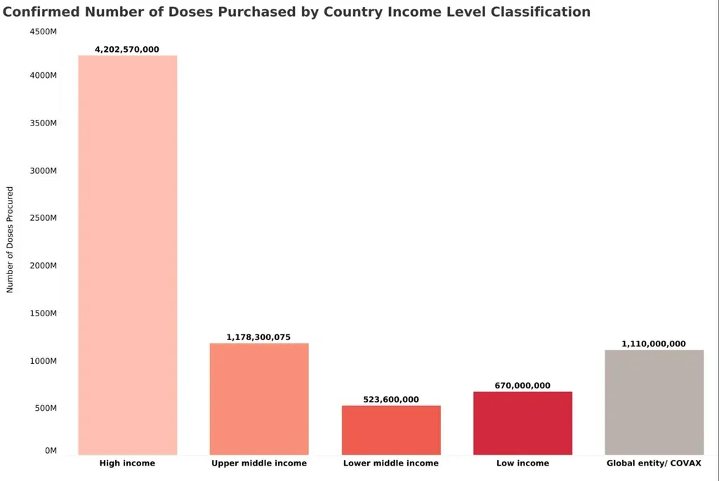 De acuerdo con los datos de la Universidad de Duke, los países de ingresos altos han confirmado la adquisición de 4.200 millones de dosis, los países de ingresos medianos altos confirmaron 1.200 millones de dosis, los países de ingresos medianos bajos 524 millones de dosis y los países de ingresos bajos 670 millones de dosis.