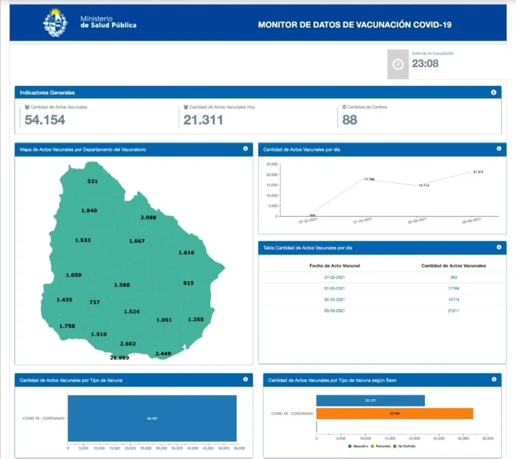 El Ministerio de Salud Pública (MSP) publicó un monitor de datos de vacunación contra el covid-19 en Uruguay, con información que se actualiza cada 60 minutos durante el día.