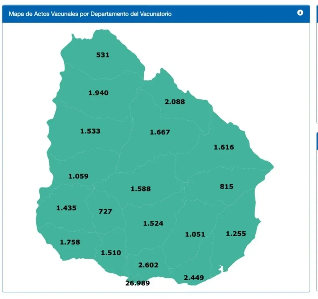 Vacunados hasta el miércoles El monitor actualiza la información por departamento. Montevideo tiene la mayor cantidad de vacunados (26.989), le sigue Canelones (2.602) y Maldonado (2.449).