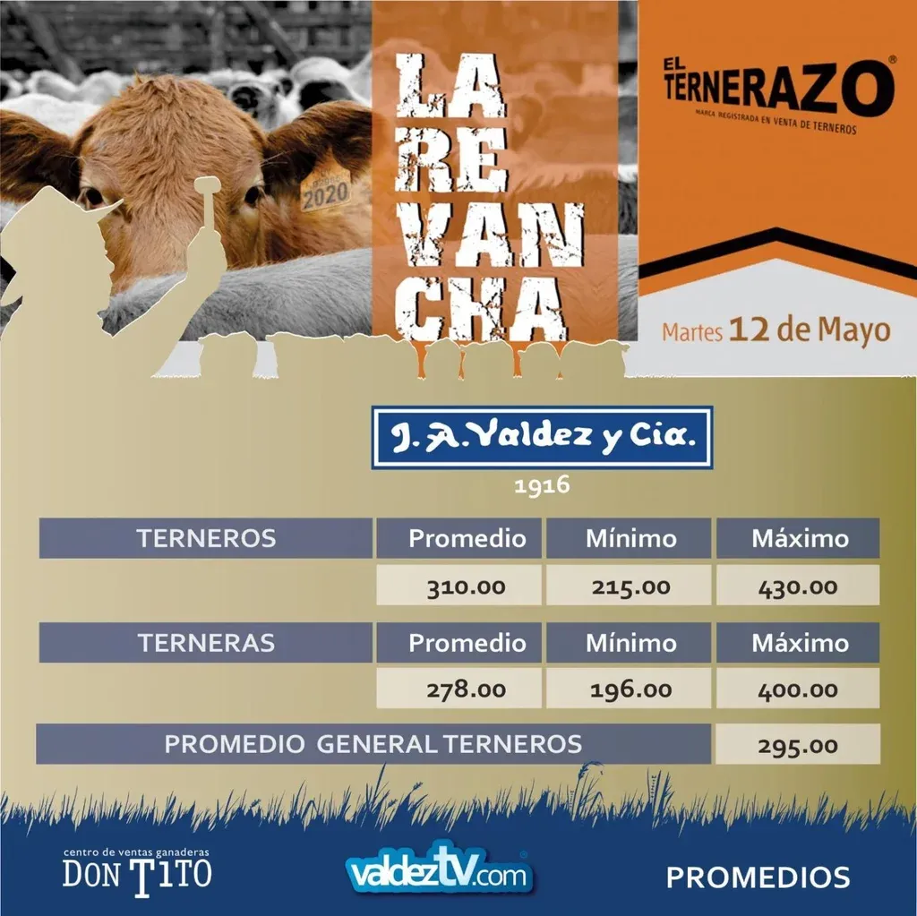 Con US$ 295 de promedio general por los 2.500 terneros comercializados, se realizó el remate La Revancha de El Ternerazo, a cargo de la centenaria firma Valdez y Cía, el martes 12 y en el Centro de Ventas Ganaderas Don Tito.