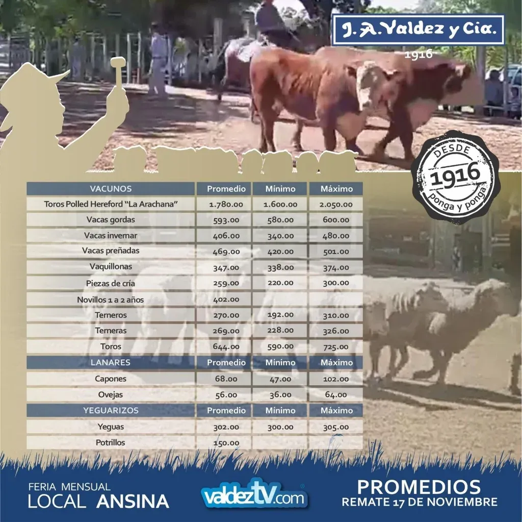 El escritorio Valdez y Cía realizó una nueva feria mensual en local Ansina, ubicado en Tacuarembó, y logró un valor máximo de US$ 2.050 para un toro Polled Hereford de "La Arachana".