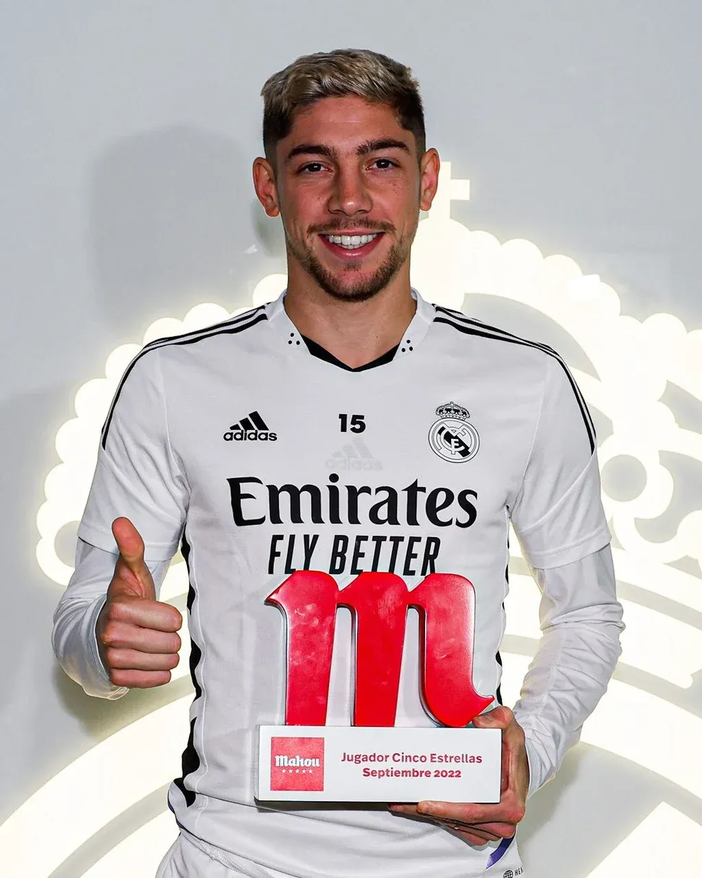 Fede Valverde con el premio al Jugador Cinco Estrellas Mahou de setiembre 2022