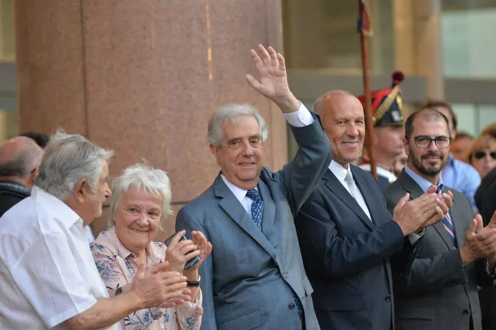 A las 20.01 del sábado Tabaré Vázquez levantó sus brazos con el clásico gesto de la V de la Victoria mientras los militantes tras las vallas amarillas en la Plaza Independencia entonaban "Volveremos, volveremos, volveremos otra vez; volveremos a ser gobierno, como la primera vez". Segundos después se subió al vehículo y dejó atrás la sede de la presidencia. Una hora había durado su última ceremonia protocolar como presidente de la República, y el posterior saludo a figuras del Frente Amplio presentes como el ex presidente José Mujica, la vicepresidenta Lucía Topolansky, familiares y funcionarios.
