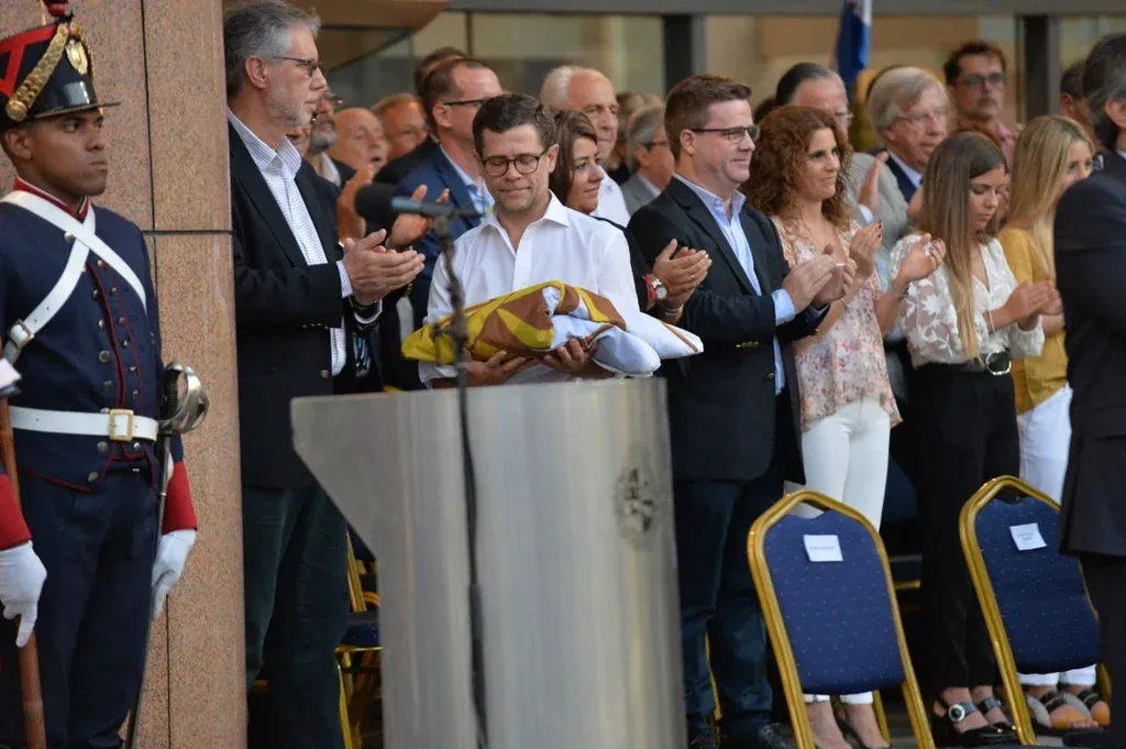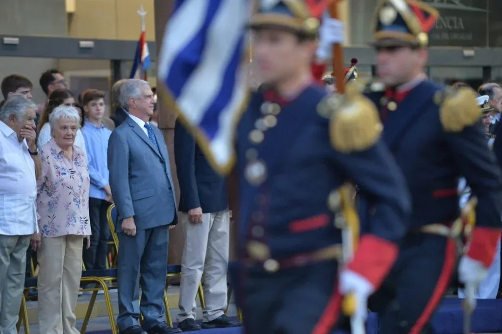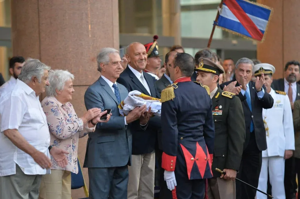 Durante los siguientes minutos la atención se concentró en el paso firme y casi teatral de los blandengues, y el proceso parsimonioso y prolijo de bajar las tres banderas patrias y doblarlas. Y después se produjo la entrega a Vázquez del pabellón nacional, "en reconocimiento a los servicios prestados" como se escuchó a un locutor explicar por el altavoz. Vázquez le pidió uno de sus hijos que sostuviera el pabellón, y saludó a los presentes, para después abrazar a Topolansky y Mujica.