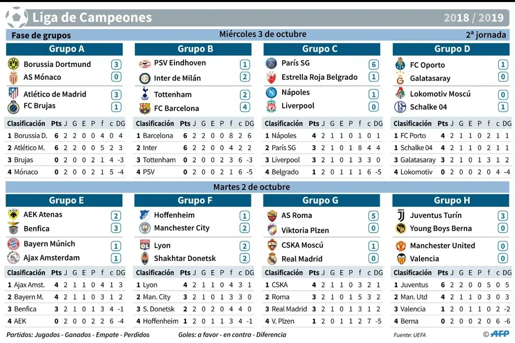 Por su parte, en el grupo C, Lorenzo Insigne anotó sobre el final el único tanto del partido entre Nápoles y Liverpool, que coloca a los italianos líderes de la llave con 4 puntos, por encima de las tres unidades de los ingleses. La zona la lidera París SG que goleó 6-1 al Estrella Roja, con triplete de Neymar (20’, 22’ y 81’) y goles del uruguayo Edinson Cavani (37’), del argentino Ángel Di María (41’) y de Kylian Mbappé (70’).