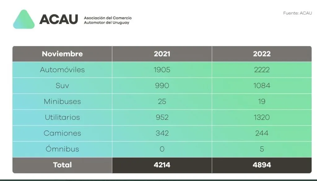 Según la información divulgada por la Asociación del Comercio Automotor (ACAU), durante el undécimo mes del año se comercializaron 4.894 unidades nuevas, frente a 4.214 del mismo mes del año pasado.
