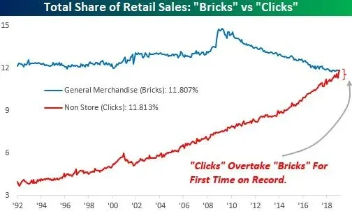 El reporte de Bespoke Investment Group reveló que el comercio “no tiendas” representó en el segundo mes del año 11,813% de todas las ventas en Estados Unidos, mientras que el "comercio general" aportó con 11,807%.