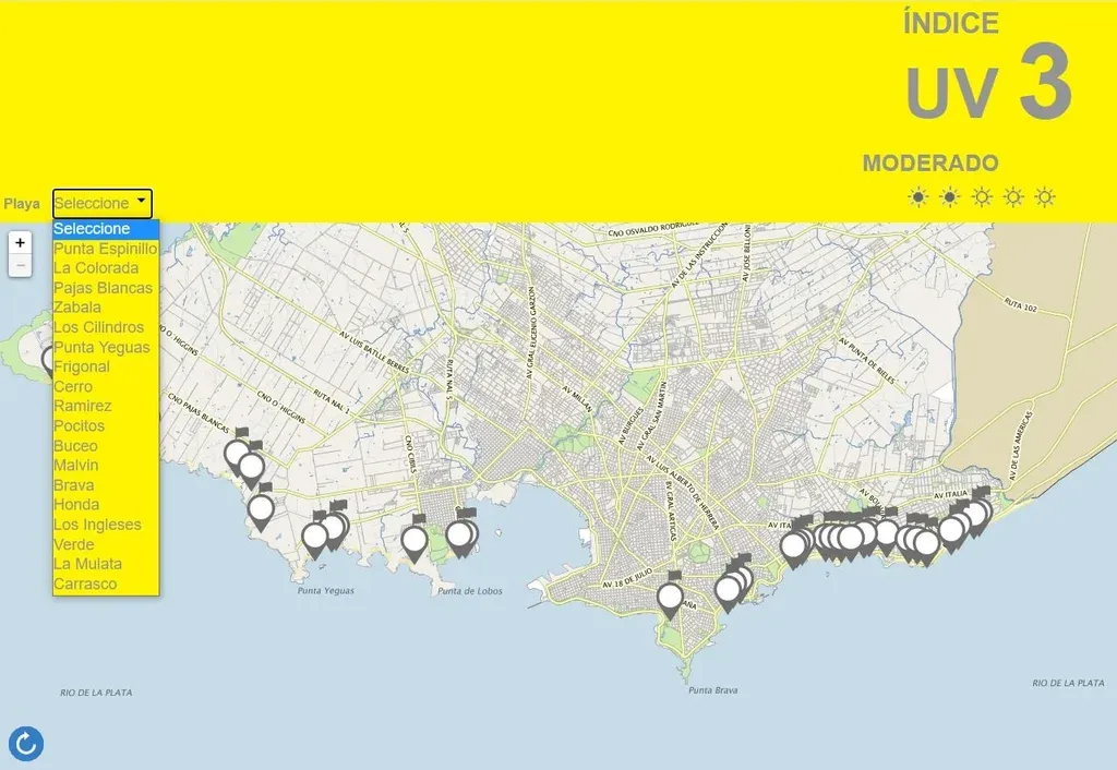 Una vez se entra a la plataforma —sea vía web o app—, el usuario ve cuánto es el índice UV y qué riesgo presenta para las quemaduras en la piel. Debajo se observa un mapa de la costa montevideana con varios puntos para acceder; por el contrario, también cuenta con una lista para seleccionar a qué playa se quiere ver la información correspondiente.