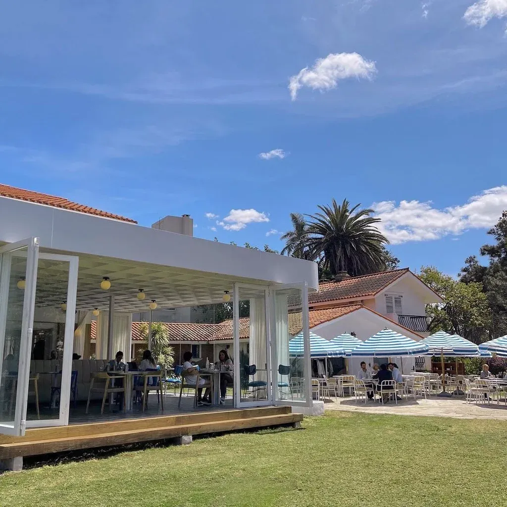 Las sombrillas se mantienen en el aire como una bandera. Una insignia: las franjas blancas y azules aparecen en el cielo como la señal de que ese es el lugar. Otero se instaló en una esquina de Carrasco como un rincón de tranquilidad para disfrutar de una propuesta de diseño y gastronomía.