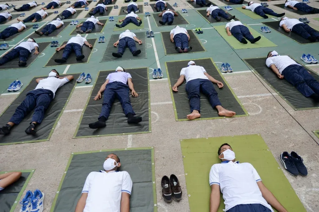 Policías de Bangladés asisten a una clase de yoga que busca mejorar el sistema inmunológico del personal policial