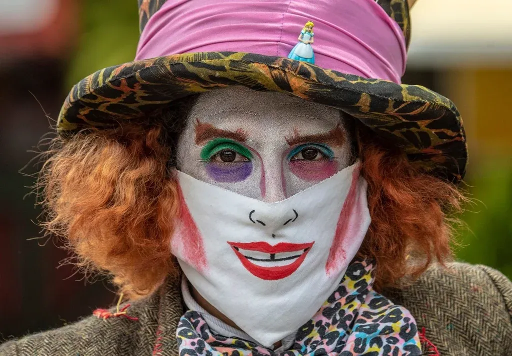 Un migrante venezolano disfrazado de un personaje de Alicia en el país de las maravillas actúa en las calles de Bogotá