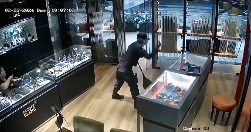 En las imágenes de la cámara de seguridad de uno de los comercios, divulgadas por Subrayado, se ve cómo uno de los asaltantes vestido de policía ingresa con un martillo, rompe tres vitrinas, guarda las joyas en una mochila y huye. El hecho lo vieron al menos dos mujeres que estaban atrás de los mostradores.
