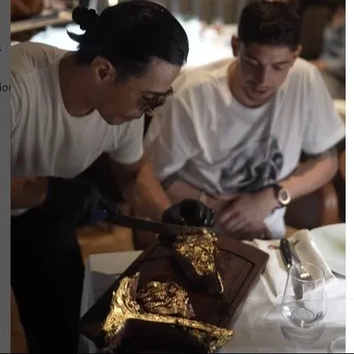 Federico Valverde y Salt Bae Los filetes recubiertos de oro que ofrece en sus restaurantes de lujo, bañados en láminas comestibles del metal precioso de 24 quilates, cuestan más de 500 dólares, pero no son del gusto de todos, en particular de los críticos gastronómicos británicos y estadounidenses, que los consideran "banales" e "insípidos".