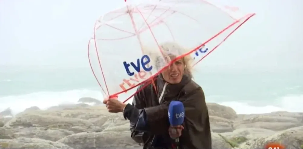 En una intervención en directo para el canal 24 Horas, la periodista Paula Filgueiras experimentó de primera mano el riesgo de estar en el exterior durante esta tormenta. Mientras informaba su paraguas resultó dañado y el viento casi la derriba. Todo esto fue observado por el presentador en el estudio, quien le indicó que se refugiara en una zona segura.