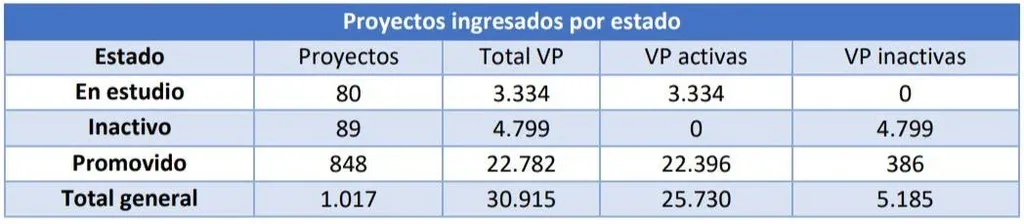 De los 1.017 proyectos ingresados a la ANV, 848 se encuentran promovidos y 80 en estudio. Por otro lado, 89 se encuentran inactivos. El total de viviendas es de 25.730, tanto en los proyectos promovidos como en estudio, lo que da un promedio de 28 viviendas por proyecto.