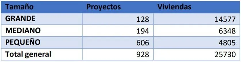 Los proyectos promovidos y en estudio son mayoritariamente proyectos pequeños, es decir de hasta 20 unidades. Por otra parte, 128 proyectos son gran porte, mayor a 50 unidades. Sin embargo, las viviendas promovidas se concentran en los proyectos de gran porte, sumando más de la mitad de las mismas.
