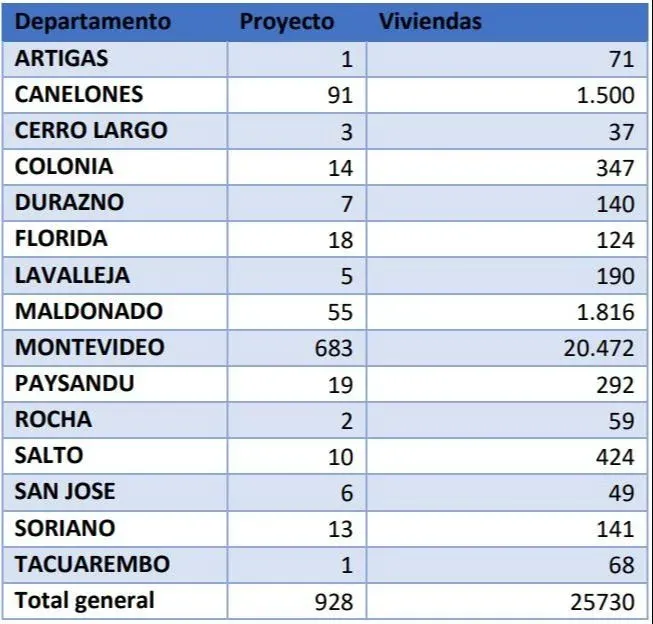 Montevideo concentra la mayor parte de los proyectos y viviendas ingresadas: 683 de los 928 proyectos promovidos o en estudio se localizan en Montevideo. Le siguen Canelones con 91 y Maldonado con 55. En el resto del país han ingresado 99 proyectos, destacándose Paysandú, Florida, Colonia, Soriano y Salto. Montevideo también aloja la mayor cantidad de viviendas, superando las 20 mil. Maldonado aparece en segundo lugar con 1.816 y Canelones en tercero con 1.500. En el resto del país se destacan Salto con 424 viviendas, Colonia con 347 y Paysandú con 292.