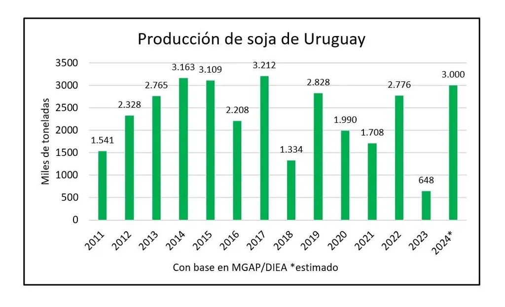 Dos de cada tres toneladas de soja se exportan por Nueva Palmira aunque en la novel terminal granelera de Montevideo también ha sido habitualmente el principal producto de exportación, con la excepción del año 2023 desastroso para la soja, cuando fue superado por el arroz.