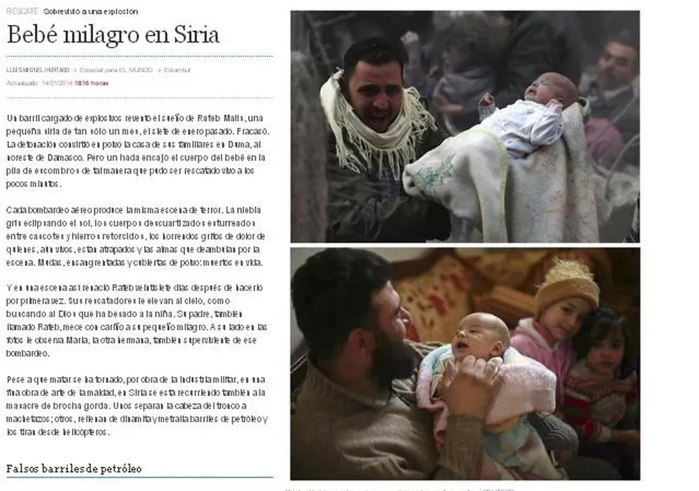 El corresponsal del diario español El Mundo describió así la escena: “Cada bombardeo aéreo produce la misma escena de terror. La niebla gris eclipsando el sol, los cuerpos descuartizados esturreados entre cascotes y hierros retorcidos, los horrendos gritos de dolor de quienes, aún vivos, están atrapados y las almas que deambulan por la escena. Mudas, ensangrentadas y cubiertas de polvo: muertos en vida. Y en una escena así renació Rateb veintisiete días después de hacerlo por primera vez. Sus rescatadores le elevan al cielo, como buscando al Dios que ha besado a la niña. Su padre, también llamado Rateb, mece con cariño a su pequeño milagro. A su lado en las fotos le observa Maria, la otra hermana, también superviviente de ese bombardeo.