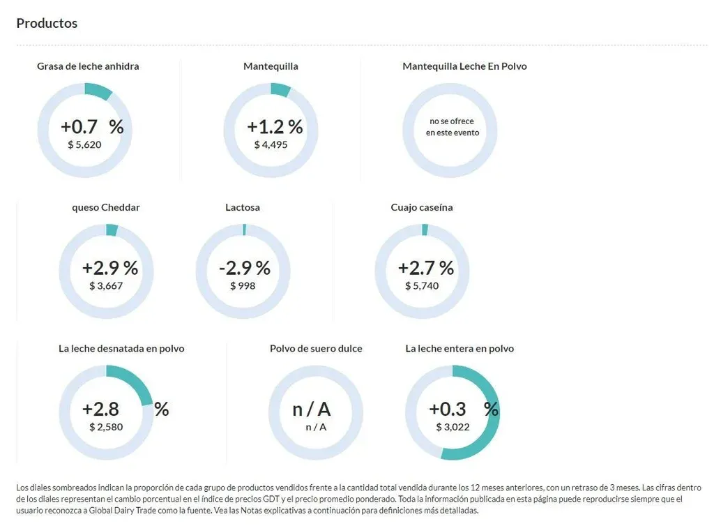 La lactosa fue el único producto que sufrió una moderada baja (de 2,9%) y cotizó a US$ 998 por tonelada.