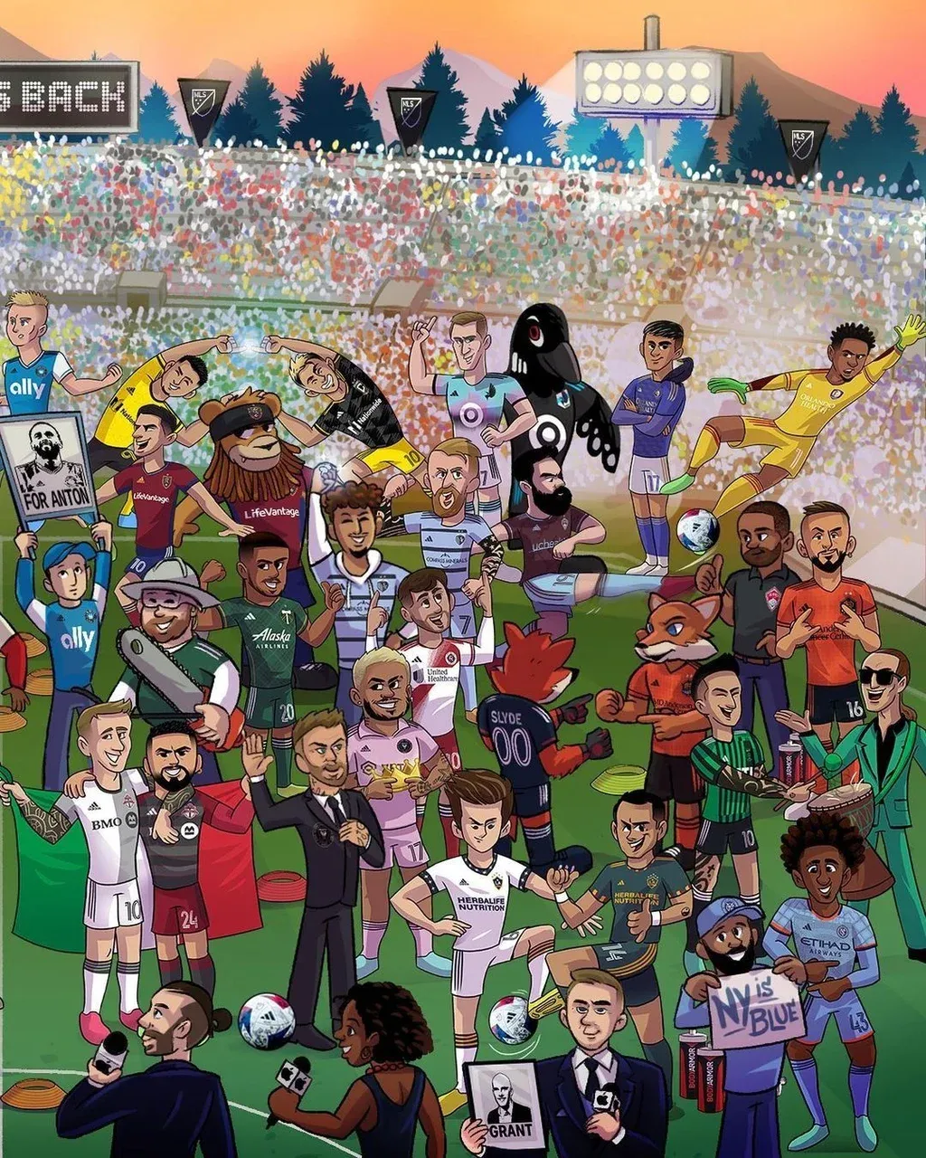 En primer plano aparece en el dibujo de presentación de la nueva temporada de la MLS, David Beckham, mientras que al fondo a la derecha, lo hace el uruguayo Facundo Torres con su atuendo violeta